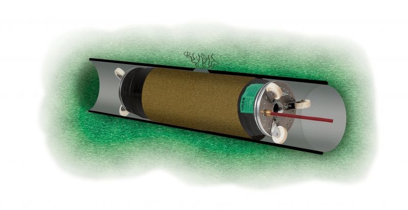 10. Далее заглушка (ремонтная вставка) надувается на определенное давление (см. таблицу по каталогу). Т.о. проволока разойдётся, и стекловолокно приклеится к поврежденному участку трубы.