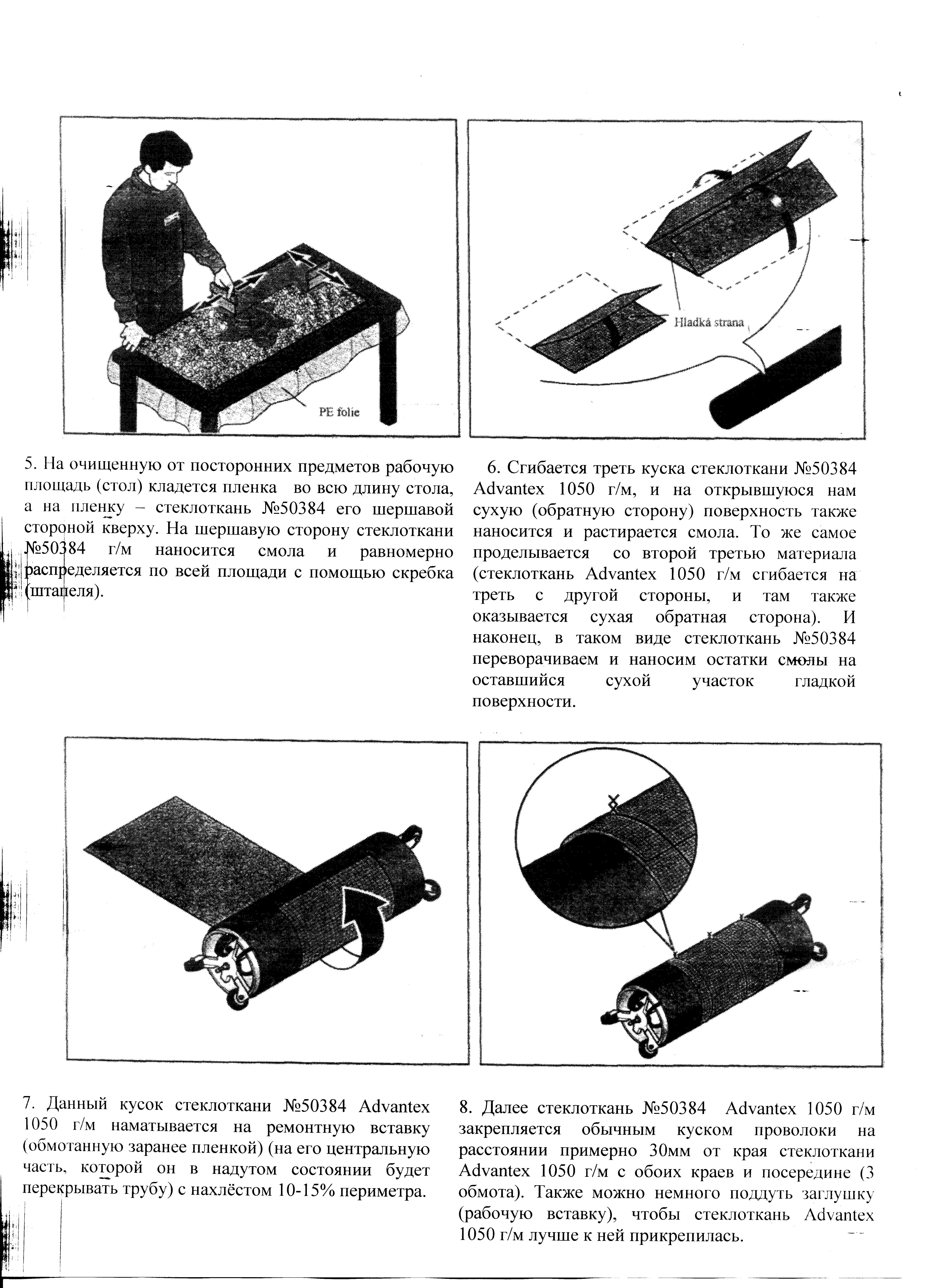 7. Данный кусок стеклоткани №50384 Advantex 1050 г/м наматывается на ремонтную вставку (обмотанную заранее пленкой) (на его центральную часть, которой он в надутом состоянии будет перекрывать трубу) с нахлёстом 10-15% периметра.